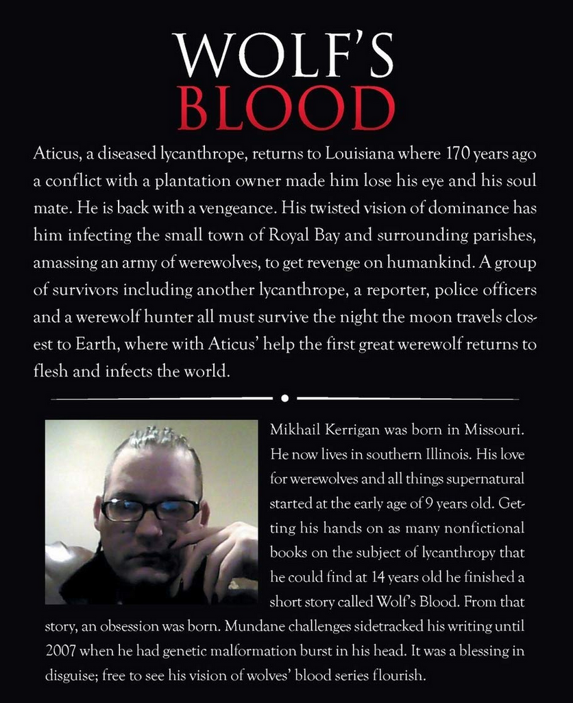 Delve deeply into the mysteries of lycanthropy & the surrounding myths. In the epic debut of wolf's blood... The arrival. First book in the trilogy of the Wolves' blood saga. Aticus, a diseased lycanthrope, returns to Louisiana where 170 years ago a conflict with a plantation owner made him lose his eye and his soul mate. He is back with a vengeance. His twisted vision of dominance has him infecting the small town of Royal Bay and surrounding parishes, amassing an army of werewolves, to get revenge on humankind. A group of survivors including another lycanthrope, a reporter, police officers and a werewolf hunter all must survive the night the moon travels closest to Earth, where with Aticus' help the first great werewolf returns to flesh and infects the world.